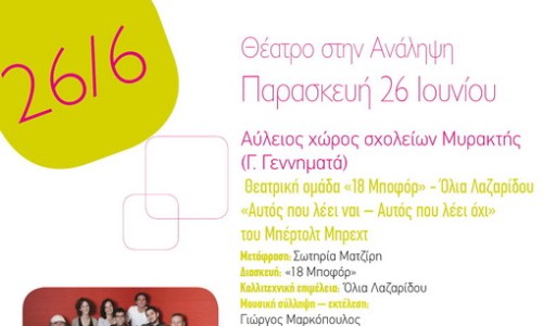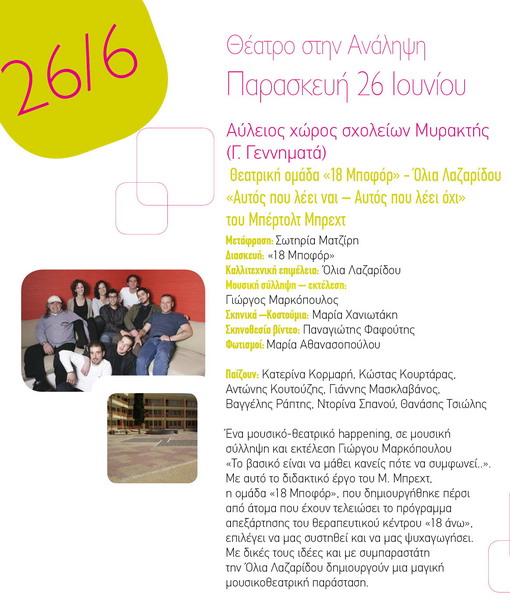 Την Παρασκευή, 26 Ιουνίου, η εβδομάδα κλείνει με τη θεατρική ομάδα "18 Μποφόρ"- Όλια Λαζαρίδου, με την μουσικο- θεατρική παράσταση: "Αυτός που λέει ναι- Αυτός που λέει όχι", του Μπέρτολτ Μπρεχτ. Όλες οι εκδηλώσεις ξεκινούν στις 20:30 και είναι δωρεάν για το κοινό.