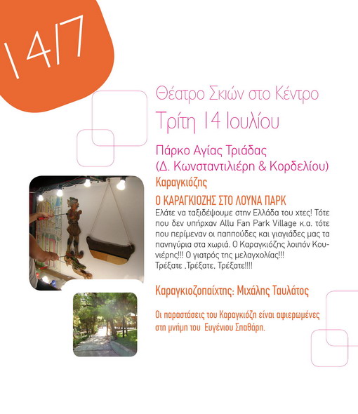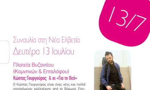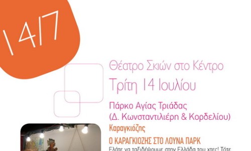 Απόψε Δευτέρα, 13 Ιουλίου σας περιμένουμε όλους στη συναυλία στη Νέα Ελβετία, στην πλατεία Βυζαντίου των "Για το Θεό" - Κώστας Γούργουρα.Αύριο Τρίτη, στο πάρκο της Αγίας Τριάδας, στο κέντρο του Βύρωνα, τους μικρούς μας φίλους περιμένει μια παράσταση από το Θέατρο Σκιών.
