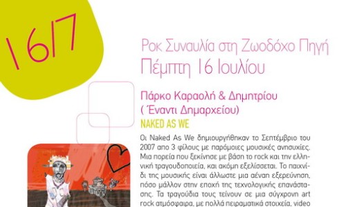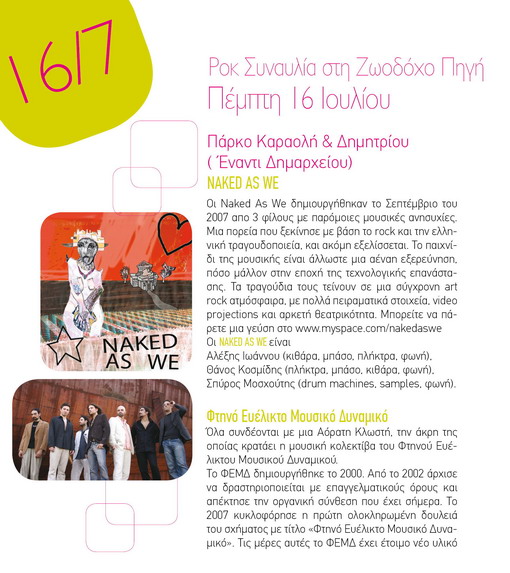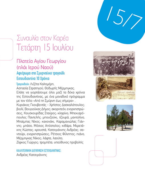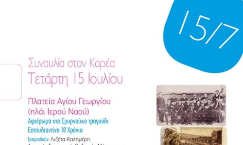 Σήμερα Τετάρτη σας περιμένουμε όλους στη συναυλία-αφιέρωμα στο Σμυρναίικο Τραγούδι στην πλατεία Αγ. Γεωργίου στον Καρέα. Τα τραγούδια ερμηνεύει το μουσικό σύνολο Εστουδιαντίνα.Αύριο Πέμπτη το ραντεβού μας είναι στο Πάρκο Καραολή & Δημητρίου (απέναντι από το Δημαρχείο) για μια ροκ συναυλία με τους Naked as we, Φτηνό Ευέλικτο Μουσικό Δυναμικό και Kyklos-Band.