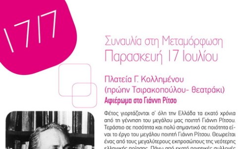 Την Παρασκευή οι εκδηλώσεις των "Γειτονιών Πολιτισμού 2009" ολοκληρώνονται με τη συναυλία-αφιέρωμα στο μεγάλο έλληνα ποιητη Γιάννη Ρίτσο. Στην πλατεία Κολλημένου, στη Μεταμόρφωση, θα ακουστούν αποσπάσματα από τα έργα του Επιτάφιος, Ρωμιοσύνη και Λιανοτράγουδα της Πικρής Πατρίδας.