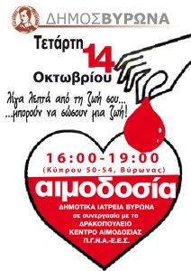 Την Τετάρτη 14 Οκτωβρίου 2009, από τις 16:00 έως και τις 19:00, ο Δήμος Βύρωνα σε συνεργασία με το Δρακοπούλειο Ίδρυμα διενεργεί εθελοντική αιμοδοσία στο χώρο των Δημοτικών Ιατρείων του Δήμου (Κύπρου 50- 54).Σας περιμένουμε όλους, γιατί λίγες σταγόνες από το αίμα μας μπορούν να σώσουν μια ζωή.