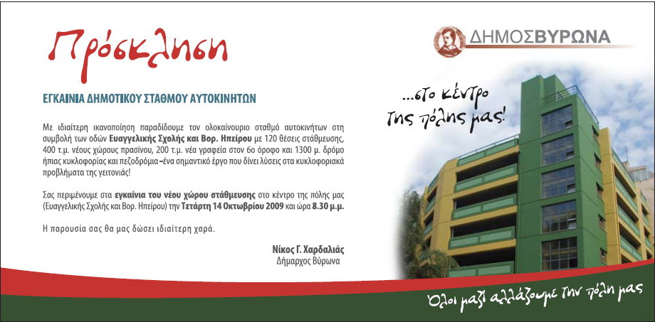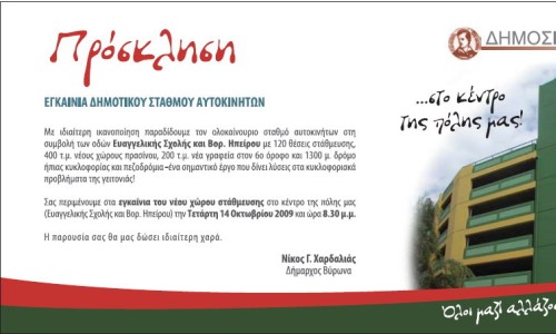 Την Τετάρτη 14 Οκτωβρίου στις 8:30μ.μ. εγκαινιάζουμε το νέο δημοτικό σταθμό αυτοκινήτων στο κέντρο της πόλης μας (Βορείου Ηπείρου & Ευαγγελικής Σχολής), με 120 θέσεις στάθμευσης, 400 τ.μ. νέους χώρους πρασίνου, 200 τ.μ. νέα γραφεία στον 6ο όροφο και 1300μ. δρόμο ήπιας κυκλοφορίας και πεζοδρόμια. Ένα έργο που πρόκειται να διευκολύνει τη στάθμευση στην περιοχή. Σας περιμένουμε από νωρίς για να απολαύσουμε πολλές και ενδιαφέρουσες εκδηλώσεις.