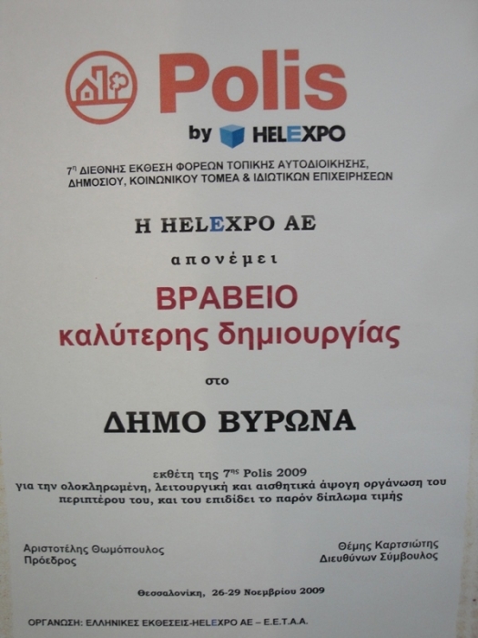 Το βραβείο «Καλύτερης Δημιουργίας» απέσπασε το Περίπτερο του Δήμου Βύρωνα για την ολοκληρωμένη, λειτουργική και αισθητικά άψογη οργάνωσή του, στην 7η Διεθνή Έκθεση Φορέων Τοπικής Αυτοδιοίκησης, Δημοσίου – Κοινωνικού Τομέα και Ιδιωτικών Επιχειρήσεων «POLIS 2009», που έγινε στη Θεσσαλονίκη. Το αναμνηστικό δίπλωμα τιμής απένειμε στο Δήμαρχο Βύρωνα Νίκο Γ. Χαρδαλιά ο Διευθύνων Σύμβουλος της HELEXPO Α.Ε. Θέμης Καρτσιώτης, ο οποίος συνεχάρη τα μέλη της αποστολής για το αποτέλεσμα της παρουσίας του Δήμου Βύρωνα στην Διεθνή Έκθεση.