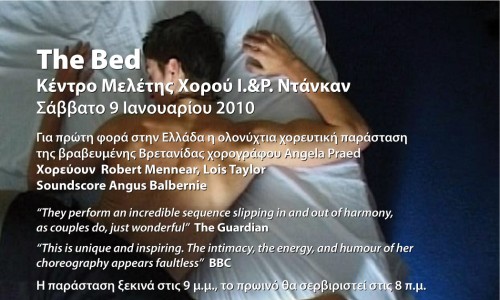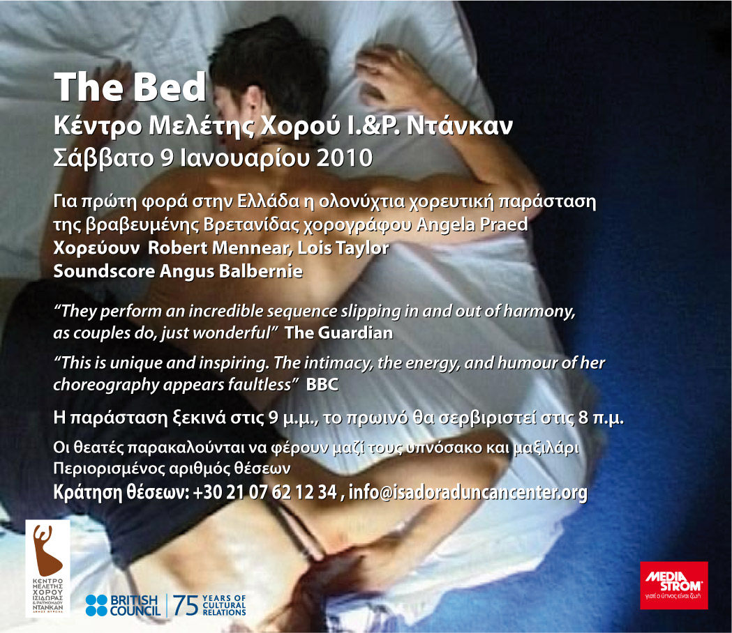 Τo Κέντρο Χορού Ντάνκαν παρουσιάζει στις 9 Ιανουαρίου 2010 την ολονύχτια παράσταση "Τhe Bed" της βρετανίδας χορογράφου Angela Praed.Θα προηγηθεί τετραήμερο σεμινάριο (5- 8 Ιανουαρίου), πάνω στη χορογραφική μέθοδο και τη νοητική και σωματική προετοιμασία του performer που θα πλαισιώσουν η Angela Praed και η στενή της συνεργάτης Rosalyn Maynard.Σ ε μ ι ν ά ρ ι ο