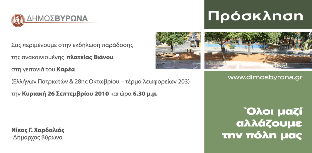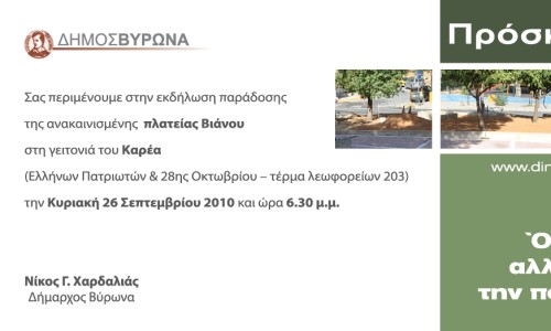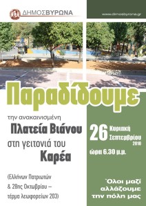 Πλήρως ανακατασκευασμένη παραδίδεται στους πολίτες του Βύρωνα η Πλατεία Βιάνου στον Καρέα, καθώς στο πλαίσιο βελτίωσης της ποιότητας ζωής και της καθημερινότητας των κατοίκων, ο Δήμος συνεχίζει με σημαντικά έργα την αναβάθμιση κάθε γειτονιάς της πόλης. Την παράδοση πραγματοποιεί την Κυριακή 26 Σεπτεμβρίου, στις 6.30 το απόγευμα, ο Δήμαρχος Βύρωνα Νίκος Χαρδαλιάς.