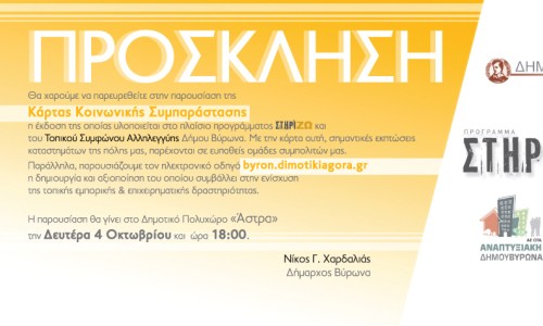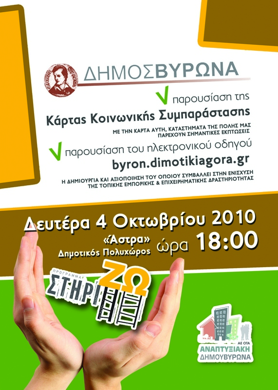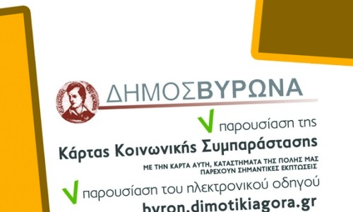 Η παρουσίαση της Κάρτας Κοινωνικής Συμπαράστασης θα γίνει στο Δημοτικό Πολυχώρο «¶στρα», τη Δευτέρα 4 Οκτωβρίου, στις 6 το απόγευμα. Παράλληλα, θα παρουσιαστεί ο ηλεκτρονικός οδηγός byron.dimotikiagora.gr, η δημιουργία και αξιοποίηση του οποίου συμβάλλει στην ενίσχυση της τοπικής εμπορικής και επιχειρηματικής δραστηριότητας.