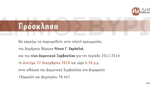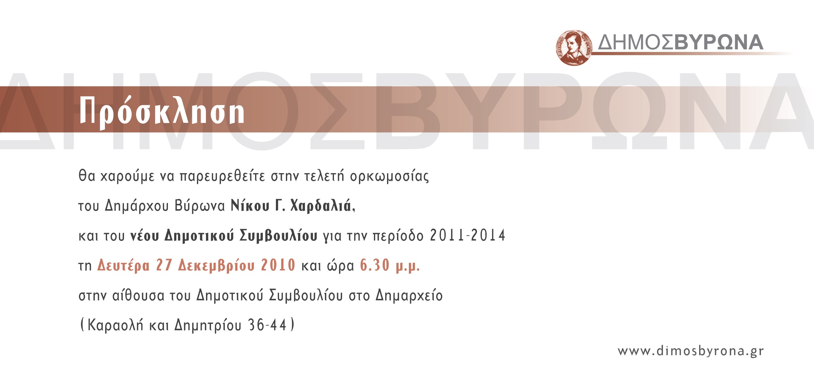 Την Δευτέρα 27 Δεκεμβρίου πραγματοποιείται η ορκομωσία του νέου Δημοτικού Συμβουλίου Βύρωνα, στις 6.30 το απόγευμα στο Δημαρχείο της πόλης. Το νέο Δημοτικό Συμβούλιο με επικεφαλής τον Νίκο Γ. Χαρδαλιά, που ανανέωσε τη θητεία του για τρίτη συνεχή φορά, αποτελείται από 41 μέλη και αναλαμβάνει τα καθήκοντά του από 1η Ιανουαρίου 2011.