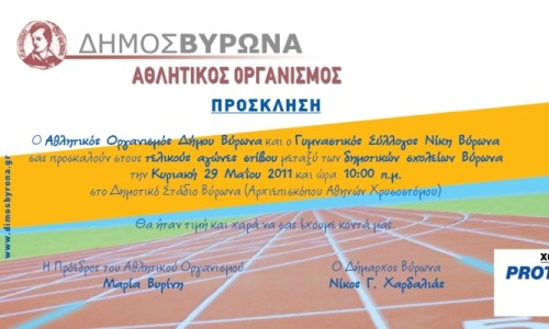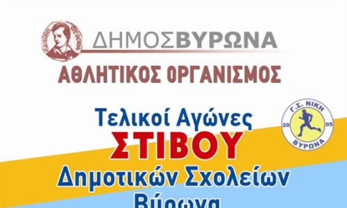 Τους Τελικούς Αγώνες Στίβου των Δημοτικών σχολείων της πόλης μας διοργανώνουν την Κυριακή 29 Μαΐου στις 10:00 π.μ. στο Δημοτικό Στάδιο, ο Αθλητικός Οργανισμός του Δήμου Βύρωνα και ο Γυμναστικός Σύλλογος Νίκη Βύρωνα.