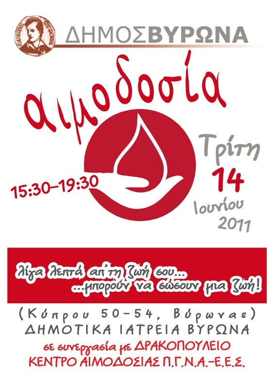 «Λίγα λεπτά από τη ζωή σου μπορούν να σώσουν μια ζωή». Με αυτό το μήνυμα, ο Δήμος Βύρωνα καλεί τους δημότες να συμμετέχουν στην αιμοδοσία που πραγματοποιείται σήμερα, από τις 15.30 μέχρι τις 19.30, στα Δημοτικά Ιατρεία της πόλης μας (Κύπρου 50-54).