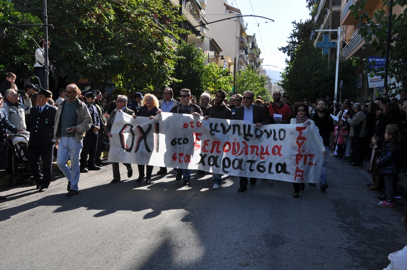 Αμέσως μετά, οι μαθητές των σχολείων του Βύρωνα παρέλασαν, ενώ ορισμένοι από αυτούς προσήλθαν στην παρέλαση φορώντας μαύρα περιβραχιόνια σε ένδειξη διαμαρτυρίας για τα όσα συμβαίνουν στη χώρα μας αλλά και για τα προβλήματα στο χώρο της παιδείας. Οι αντιδράσεις δεν έλειψαν και από πλευράς των πολιτών οι οποίοι με πορεία και συνθήματα διαμαρτυρήθηκαν έντονα ενάντια στην οικονομική πολιτική της κυβέρνησης.