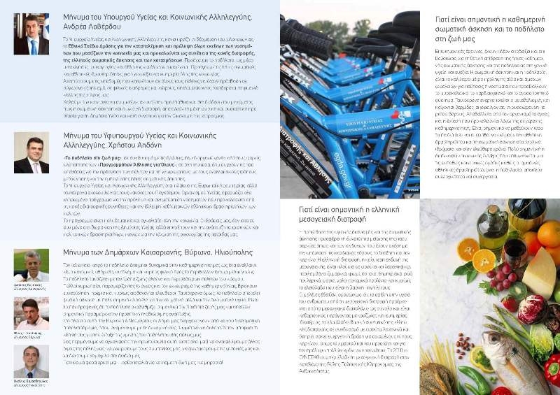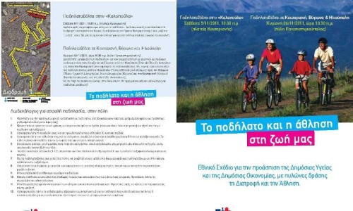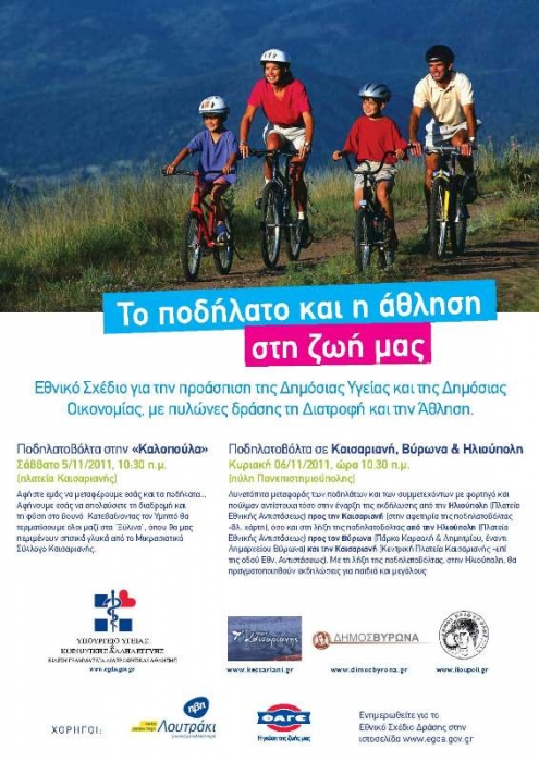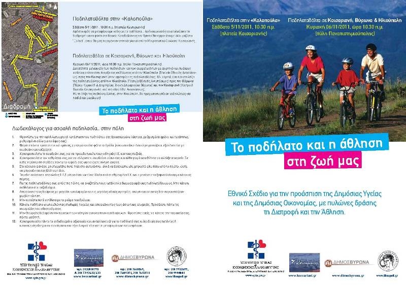 «Ποδηλατοβόλτα» -8 χιλιομέτρων- συνδιοργανώνουν την Κυριακή 6 Νοεμβρίου οι Δήμοι Καισαριανής, Βύρωνα και Ηλιούπολης, υπό την αιγίδα του Υπουργείου Υγείας & Κοινωνικής Αλληλεγγύης (Ειδική Γραμματεία Διατροφής & ¶θλησης).
