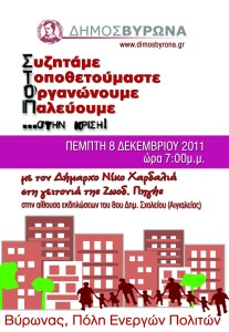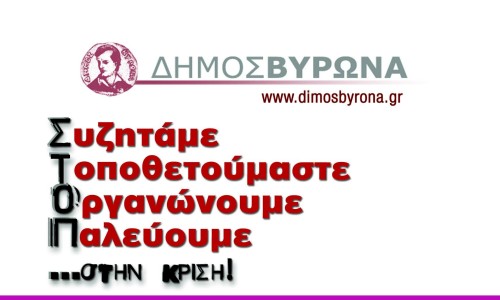 Πρόσκληση σε όλους τους Βυρωνιώτες απευθύνει ο Δήμαρχος της πόλης Νίκος Χαρδαλιάς προκειμένου να συζητήσουν για τα οξυμένα κοινωνικά και οικονομικά προβλήματα που έχει επιφέρει η κρίση και να αναζητήσουν από κοινού λύσεις, με στόχο τη βελτίωση της καθημερινότητας και την αντιμετώπιση όλων των δυσκολιών.Στο πλαίσιο αυτό, ο Δήμος Βύρωνα διοργανώνει, από τις 29 Νοεμβρίου μέχρι και τις 12 Δεκεμβρίου, το Πρόγραμμα «Βύρωνας, Πόλη Ενεργών Πόλιτών» που αποτελείται από 8 δημόσιες συναντήσεις και τρεις θεματικές ενότητες. Στη διάρκεια των θεματικών πρόκειται να συζητηθούν ζητήματα που αφορούν στην παιδεία, τον πολιτισμό και την κοινωνική αλληλεγγύη, ενώ οι 8 συναντήσεις πραγματοποιούνται σε ισάριθμες γειτονιές της πόλης μας.