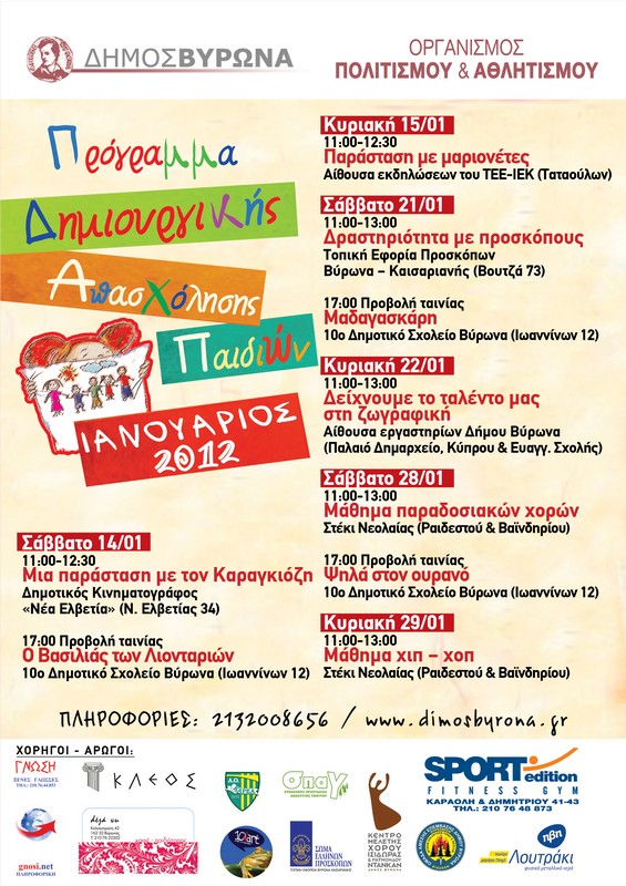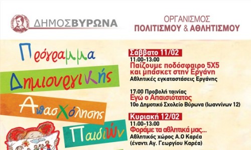 Ξεκινά το Σάββατο 14 Ιανουαρίου το Πρόγραμμα Δημιουργικής Απασχόλησης Παιδιών του Δήμου Βύρωνα. Το πρόγραμμα διάρκειας σχεδόν τριών μηνών, περιλαμβάνει πλήθος εκδηλώσεων για τους μικρούς Βυρωνιώτες, οι οποίοι θα έχουν την ευκαιρία να παίξουν, να διασκεδάσουν, να δημιουργήσουν και να μάθουν.