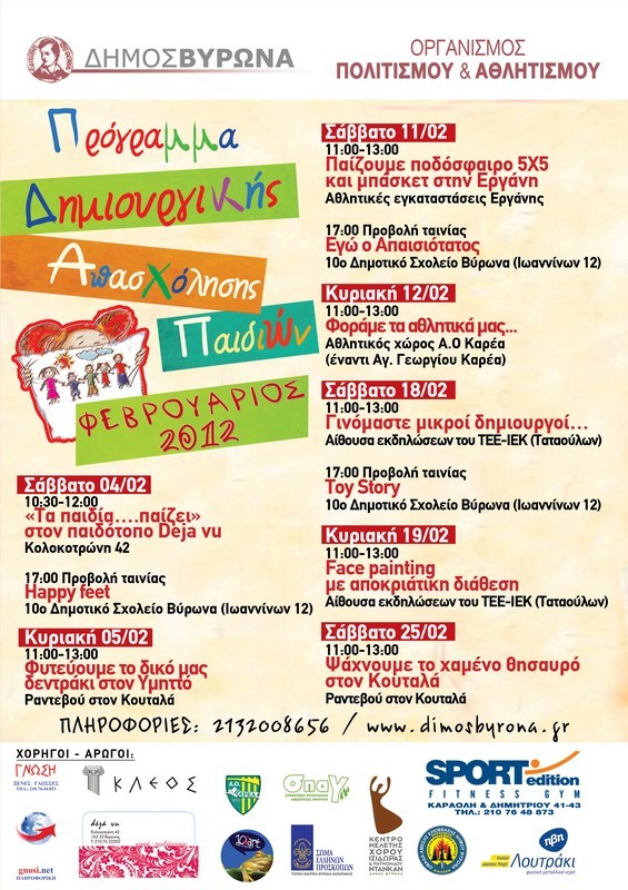 Υπενθυμίζεται ότι το Σάββατο 4 Φεβρουαρίου τα παιδιά έχουν ραντεβού στις 10.30 το πρωί, στον παιδότοπο Déjà vu (Κολοκοτρώνη 42), όπου θα παίξουν μέχρι τελικής πτώσεως. Ο παιδότοπος μπορεί να φυλοξενήσει παιδιά ηλικίας 3-9 ετών, ενώ στην περίπτωση που η προσέλευση είναι μεγάλη τα παιδιά θα χωριστούν σε ομάδες των 25 –όπως προβλέπεται από τον κανονισμό του παιδότοπου- με στόχο να απασχοληθούν δημιουργικά όλοι όσοι προσέλθουν. Τα παιδιά μεγαλύτερης ηλικίας, αλλά και τα μικρότερα αν δεν περάσουν όλη την ώρα τους στον παιδότοπο, θα παίξουν παιχνίδια και θα διασκεδάσουν στην αίθουσα του 4ου Δημοτικού σχολείου, που βρίσκεται ακριβώς δίπλα από τον παιδότοπο. Στις 5 το απόγευμα στο 10ο Δημοτικό Σχολείο Βύρωνα οι μικροί μας φίλοι θα παρακολουθήσουν την ταινία “Happy Feet”.