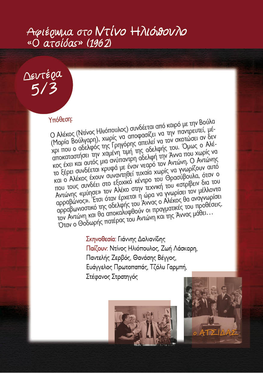 Πολιτιστικές βραδιές Αφιέρωμα στον Ντίνο Ηλιόπουλο Ο ατσίδας - 20:00 - Δημοτικός Κινηματογράφος Νέα Ελβετία