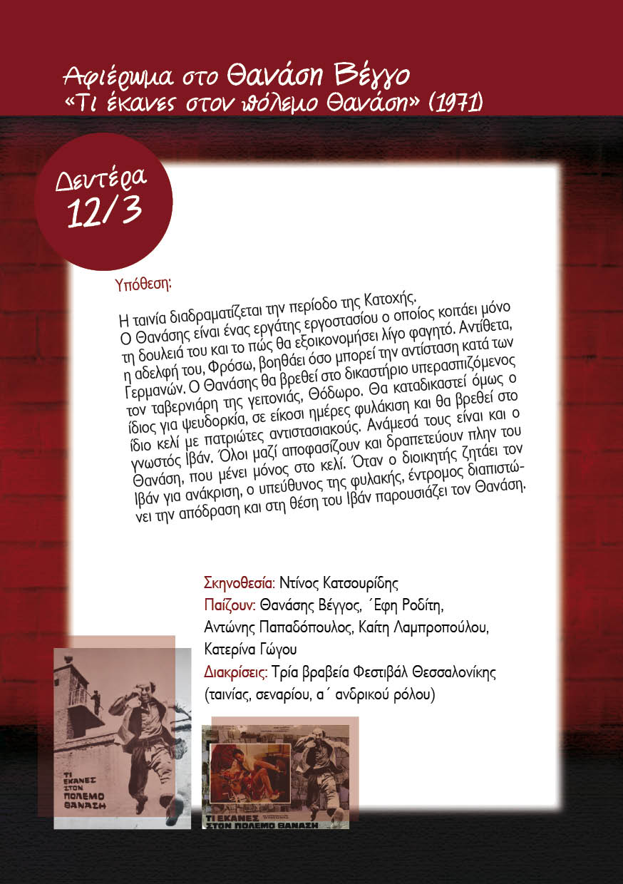 Πολιτιστικές βραδιές Αφιέρωμα στον Θανάση Βέγγο Τι έκανες στον πόλεμο Θανάση - 20:00 - Δημοτικός Κινηματογράφος Νέα Ελβετία