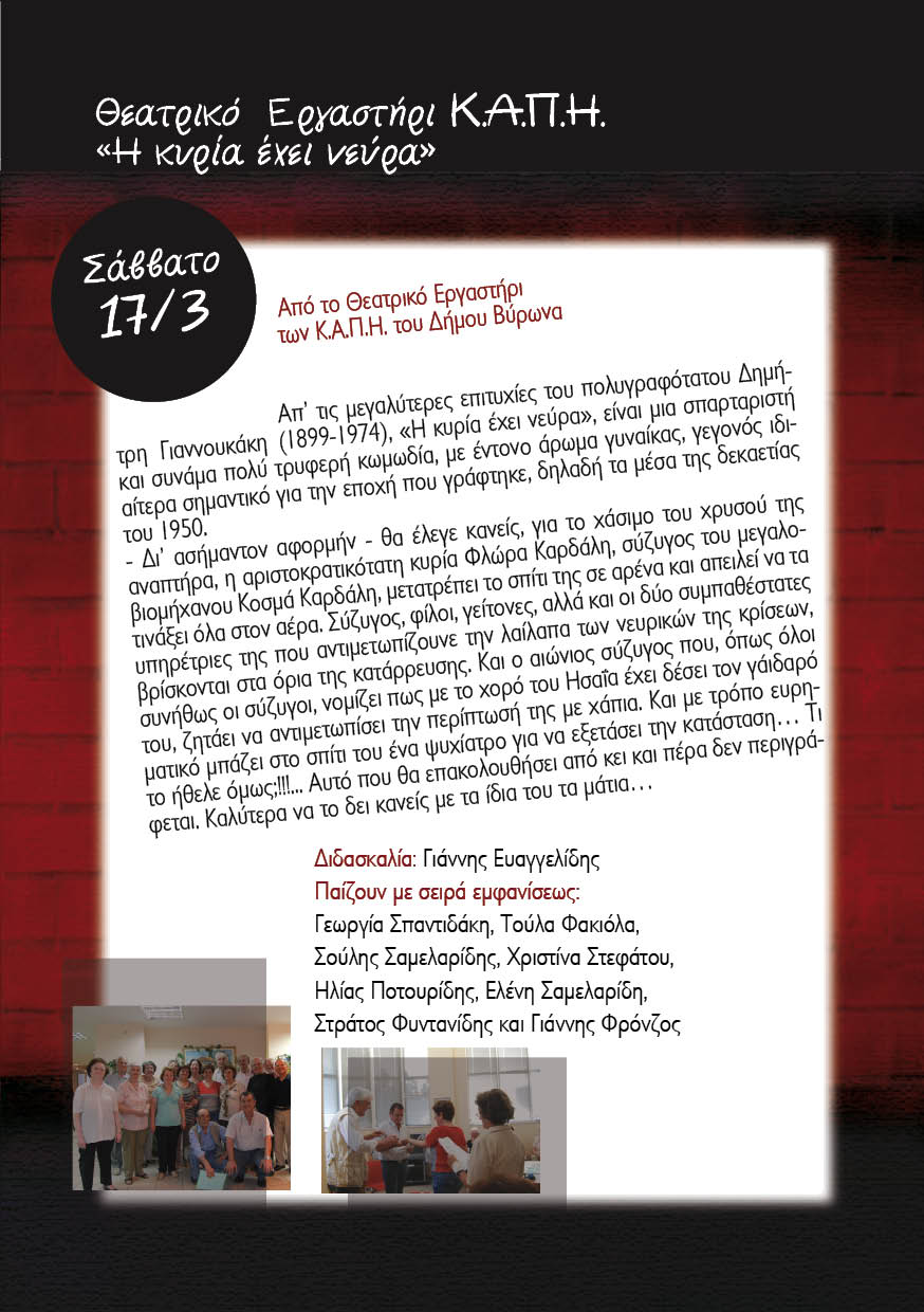 Πολιτιστικές βραδιές Η κυρία έχει νεύρα Θεατρικό Εργαστήρι ΚΑΠΗ Δήμου Βύρωνα - 20:00 - Δημοτικός Κινηματογράφος Νέα Ελβετία