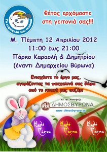 Στη γειτονιά του Βύρωνα έρχεται το κινητό πασχαλινό παζάρι του "Χαμόγελου του Παιδιού". Τη Μεγάλη Πέμπτη 12 Απριλίου, από τις 11 το πρωί μέχρι τις 9 το βράδυ, στο Πάρκο Καραολή και Δημητρίου (απέναντι από το Δημαρχείο), οι Βυρωνιώτες μπορούν να αγοράσουν τα πασχαλινά τους δώρα και να ενισχύσουν το έργο του Συλλόγου. Η εκδήλωση γίνεται με την υποστήριξη του Δήμου Βύρωνα.