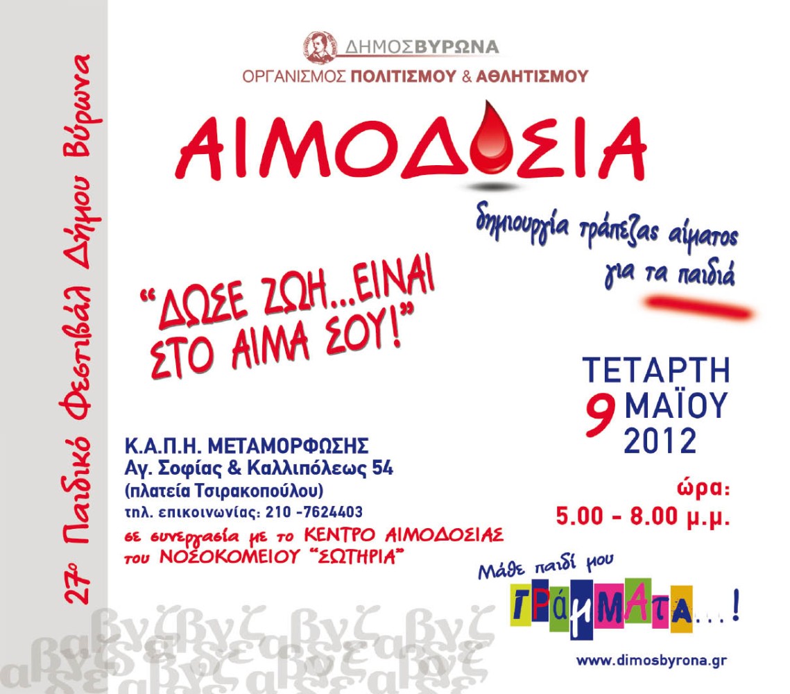 Αιμοδοσία με σκοπό τη δημιουργία Τράπεζας αίματος για τα παιδιά του Δήμου Βύρωνα, πραγματοποιείται σήμερα Τετάρτη 9 Μαΐου, από τις 5 το απόγευμα μέχρι τις 8 το βράδυ, στο ΚΑΠΗ Μεταμόρφωσης (Αγίας Σοφίας & Καλλιπόλεως 49), στο πλαίσιο του 27ου Παιδικού Φεστιβάλ της πόλης μας. Η αιμοδοσία γίνεται σε συνεργασία με το Κέντρο Αιμοδοσίας του Νοσοκομείου «Σωτηρία».