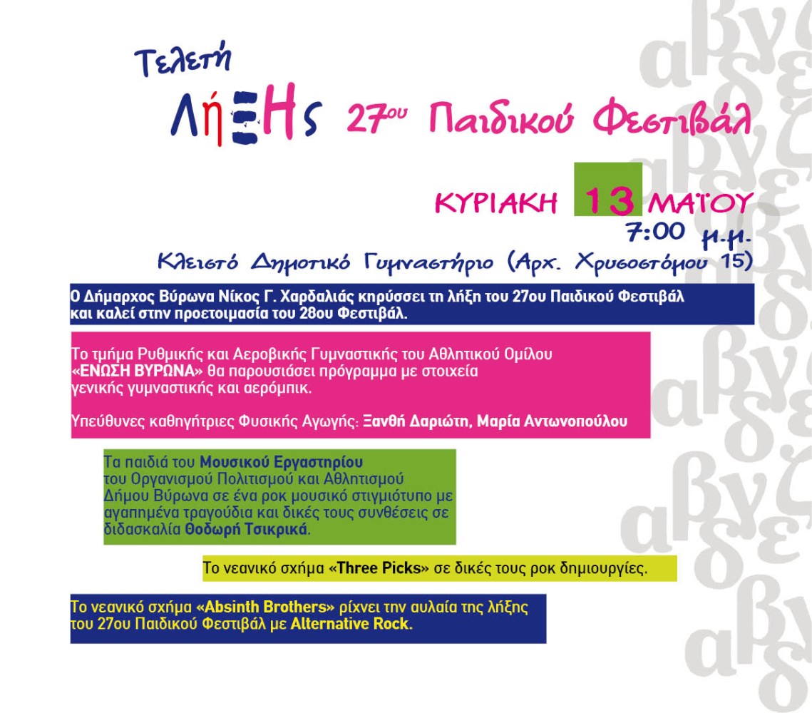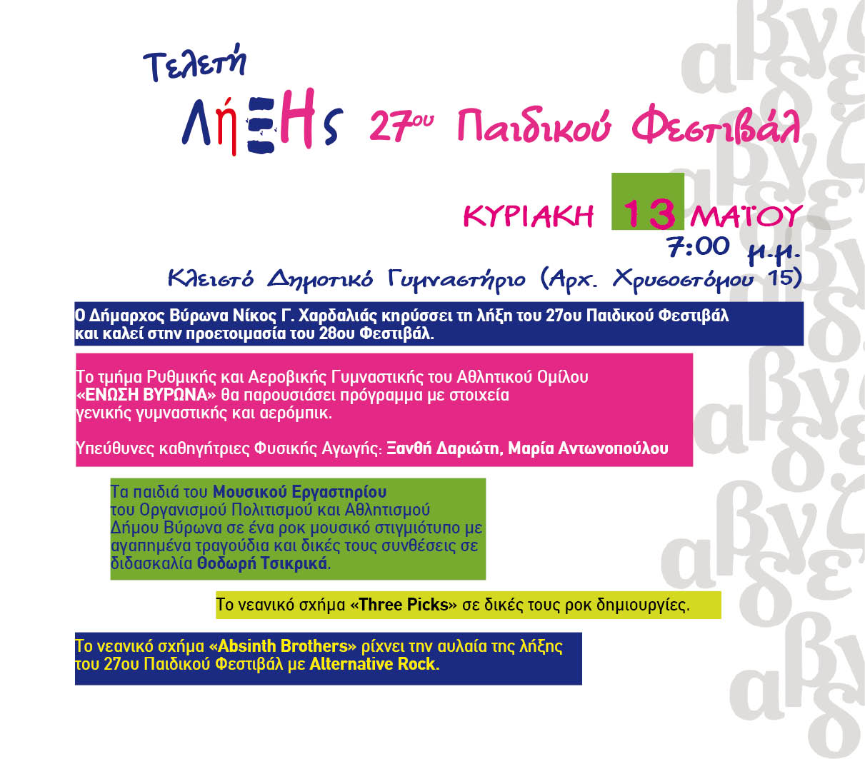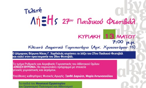 Το φετινό 27ο Παιδικό Φεστιβάλ ολοκληρώνεται την προσεχή Κυριακή. Τη λήξη θα κηρύξει ο Δήμαρχος Βύρωνα Νίκος Χαρδαλιάς σε εκδήλωση που πραγματοποιείται στις 7 το απόγευμα στο Κλειστό Δημοτικό Γυμναστήριο (Αρχ. Χρυσοστόμου 15).