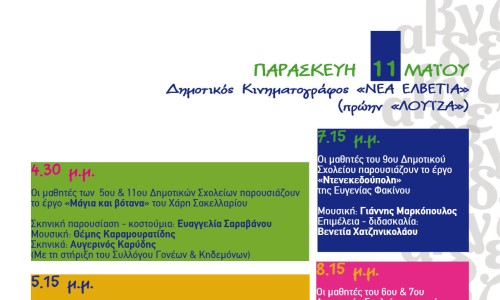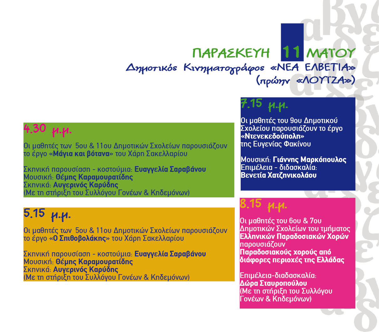 Ειδικότερα, σήμερα οι μαθητές των 5ου και 11ου Δημοτικών Σχολείων παρουσιάζουν δύο έργα του Χάρη Σακελλαρίου, «Μάγια και βότανα» (4.30) και «Ο Σπιθοβολάκης» (5.15), ενώ στις 7.15 οι μαθητές του 9ου Δημοτικού Σχολείου παρουσιάζουν το έργο «Ντενεκεδούπολη» της Ευγενίας Φακίνου. Μία ώρα αργότερα οι μαθητές των 6ου & 7ου Δημοτικού σχολείου θα χορέψουν παραδοσιακούς ελληνικούς χορούς.