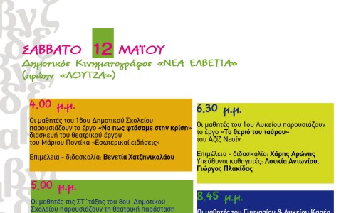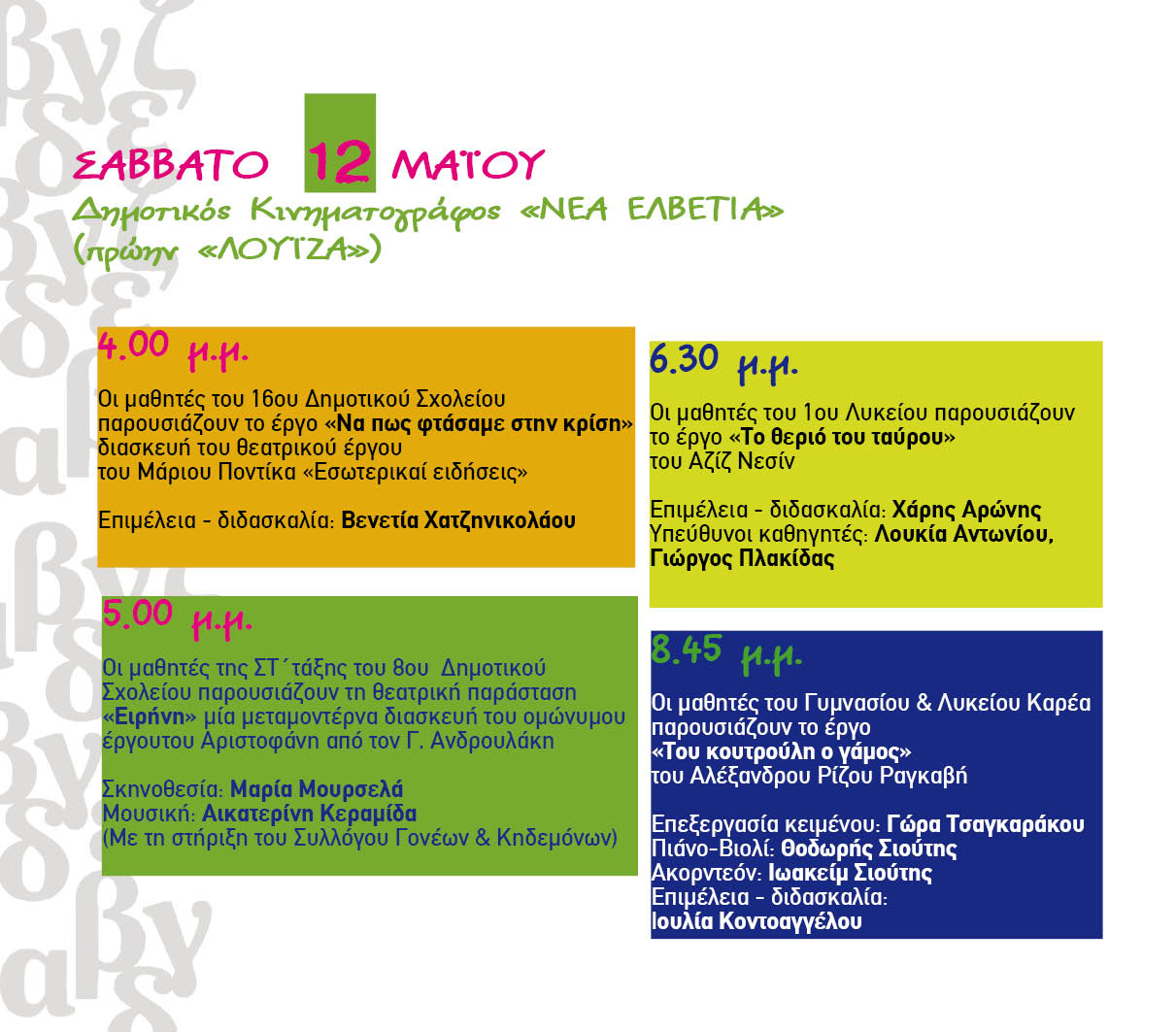 Τέσσερις παραστάσεις δίνουν οι μαθητές το Σάββατο. Πρόκειται για την παράσταση«Να πως φτάσαμε στην κρίση», διασκευή από το θεατρικό έργο του Μάριου Ποντίκα «Εσωτερικαί ειδήσεις», που παρουσιάζουν οι μαθητές του 16ου Δημοτικού Σχολείου (4.00 μ.μ), την «Ειρήνη» του Αριστοφάνη σε μια μεταμοντέρνα διασκευή από τον Γ. Ανδρουλάκη που παρουσιάζουν οι μαθητές της Στ’ τάξης του 8ου Δημοτικού Σχολείου (5.00μ.μ.), «Το θεριό του ταύρου» του Αζίζ Νεσίν, που παρουσιάζουν οι μαθητές του 1ου Λυκείου (6.30) και την παράσταση «Του κουτρούλη ο γάμος» του Αλέξανδρου Ρίζου Ραγκαβή από τους μαθητές του Γυμνασίου & Λυκείου Καρέα (8.45).