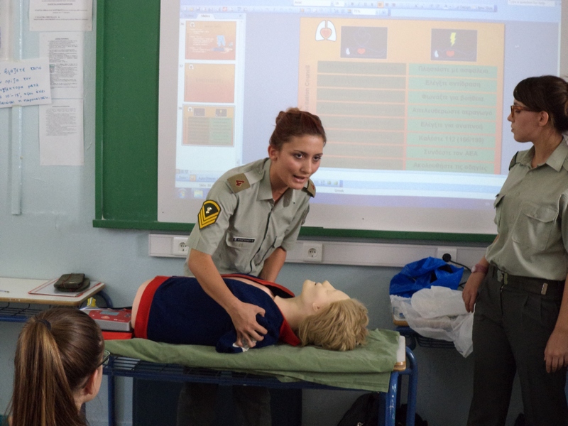 Βασικές γνώσεις «πρώτων βοηθειών» αποκτούν οι μαθητές των σχολείων της πόλης μας από τους Αποφοίτους της Σχολής Αξιωματικών Νοσηλευτών (ΣΑΝ), που εδρεύει στο στρατόπεδο Σακέτα στο Βύρωνα.