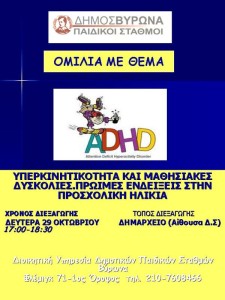 Στη διάρκεια της ομιλίας οι γονείς θα έχουν τη δυνατότητα να ενημερωθούν για τη φύση και τα χαρακτηριστικά της Διαταραχής Ελλειμματικής Προσοχής και Υπερκινητικότητας , τη σχέση της με τις Μαθησιακές Δυσκολίες και την αναγνώριση των πρώιμων ενδείξεων κατά τη διάρκεια της προσχολικής ηλικίας. Επίσης, θα αναφερθούν τεχνικές αντιμετώπισης και τρόποι παρέμβασης στην οικογένεια και τον παιδικό σταθμό.
