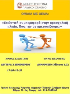 «Επιθετική συμπεριφορά στην προσχολική ηλικία. Πώς την αντιμετωπίζουμε;» είναι το θέμα της τρίτης ομιλίας, που πραγματοποιείται τη Δευτέρα 3 Δεκεμβρίου, στις 5 το απόγευμα, στην αίθουσα Δημοτικού Συμβουλίου του Δημαρχείου Βύρωνα.