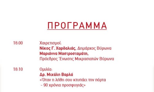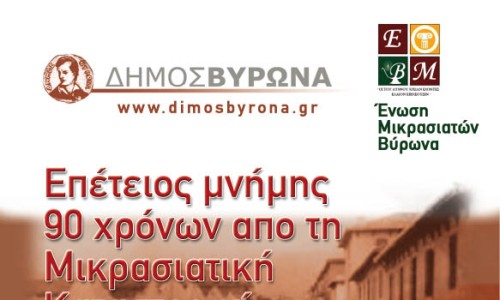 Εκδήλωση για τα 90 χρόνια από τη Μικρασιατική Καταστροφή διοργανώνει την Τετάρτη 19 Δεκεμβρίου, στις 6 το απόγευμα, στο Δημοτικό Κινηματογράφο «Νέα Ελβετία» ο Δήμος Βύρωνα σε συνεργασία με την Ένωση Μικρασιατών Βύρωνα.