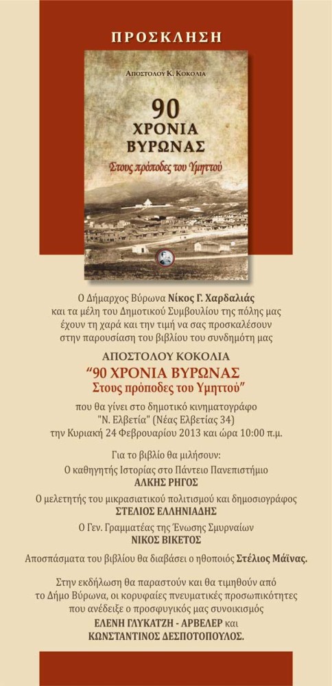 <div>Η ιστορία της πόλης μας, μια ιστορία που ξεκινά από τα παράλια της Μικράς Ασίας και συνεχίζει μέχρι τις μέρες μας, γεμάτη αγώνες και αγωνίες, πόνο και ελπίδα, ξετυλίγεται μέσα από τις σελίδες του βιβλίου «90 χρόνια Βύρωνας» του Βυρωνιώτη Απόστολου Κοκόλια. Η παρουσίαση του βιβλίου θα γίνει την Κυριακή 24 Φεβρουαρίου, στις 10 το πρωί, στον Δημοτικό Κινηματογράφο «Νέα Ελβετία» (Νέας Ελβετίας 34, Βύρωνας).</div>