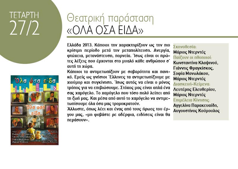 Βραδιές Πολιτισμού: Θεατρική παράσταση Όλα όσα είδα - 20:00 - Δημοτικός Κινηματογράφος Νέα Ελβετία