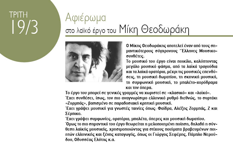 Βραδιές Πολιτισμού: Αφιέρωμα στο λαϊκό έργο του Μίκη Θεοδωράκη - 20:00 - Δημοτικός Κινηματογράφος Νέα Ελβετία