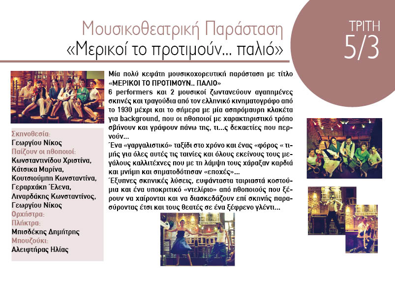 Ένα μουσικοχορευτικό ταξίδι στο χρόνο και την εποχή του παλιού αγαπημένου ελληνικού κινηματογράφου έχει την ευκαιρία να κάνει το κοινό που θα παρακολουθήσει την παράσταση «Μερικοί το προτιμούν… παλιό», με την οποία συνεχίζονται οι «Βραδιές πολιτισμού» στο Δήμο Βύρωνα, την Τρίτη 5 Μαρτίου, στον Δημοτικό Κινηματογράφο «Νέα Ελβετία».