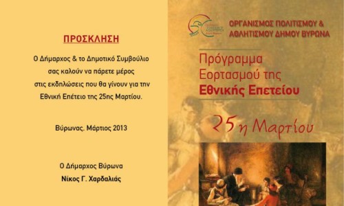 Την εθνική επέτειο της 25ης Μαρτίου τιμά και φέτος ο Δήμος Βύρωνα. Οι εορταστικές εκδηλώσεις κορυφώνονται τη Δευτέρα με την καθιερωμένη μαθητική παρέλαση.