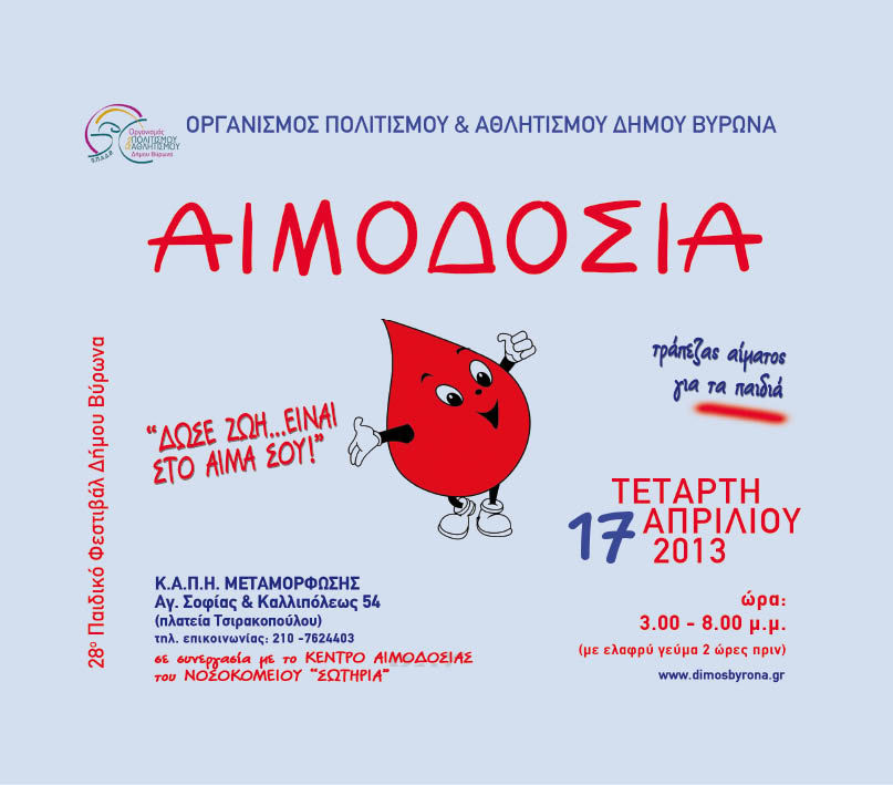 28ο Παιδικό Φεστιβάλ - ΚΑΠΗ Μεταμόρφωσης <br>15:00-20:00 Εθελοντική αιμοδοσία</br>