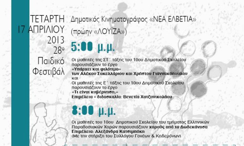 Δύο θεατρικές παραστάσεις «ανεβάζουν» οι μαθητές του 10ου Δημοτικού Σχολείου, σήμερα στις 5 το απόγευμα. Πιο συγκεκριμένα, οι μαθητές της ΣΤ’ τάξης παρουσιάζουν το έργο «Υπάρχει και φιλότιμο» των Αλέκου Σακελλάριου και Χρήστου Γιαννακόπουλου, ενώ οι μαθητές της Ε’ τάξης το έργο «Τι είναι κυβέρνηση;».