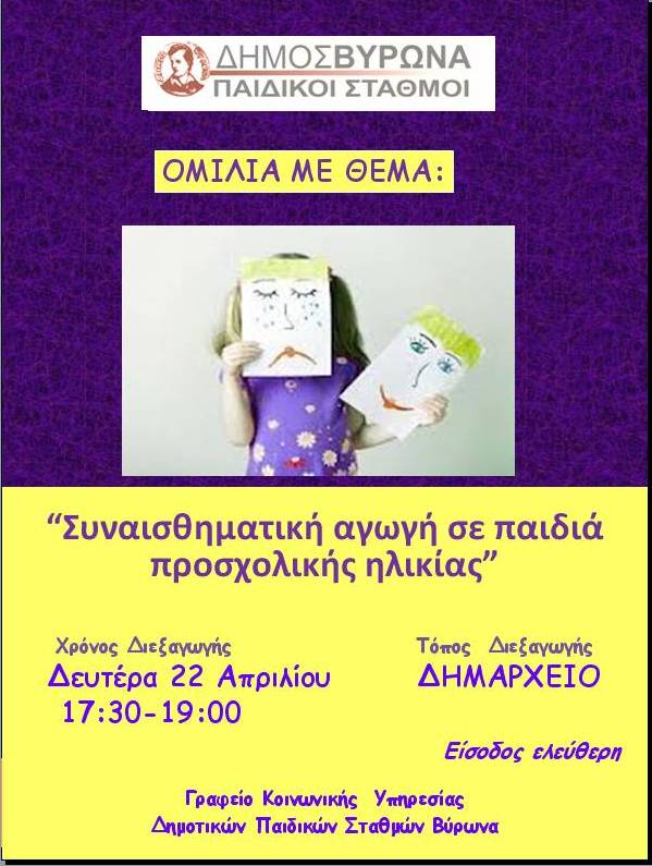 Ομιλία με θέμα Συναισθηματική αγωγή σε παιδιά προσχολικής ηλικίας - 17:30 - Δημαρχείο Βύρωνα