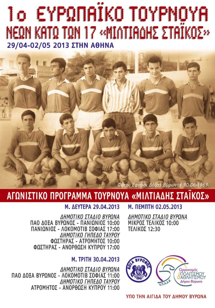 Τουρνουά ποδοσφαίρου για νέους κάτω των 17 ετών διοργανώνει η ΠΑΟ Δόξα Βύρωνα σε συνεργασία με τον Οργανισμό Πολιτισμού και Αθλητισμού της πόλης μας και υπό την αιγίδα του Δήμου Βύρωνα, στη μνήμη του Μιλτιάδη Στάικου.