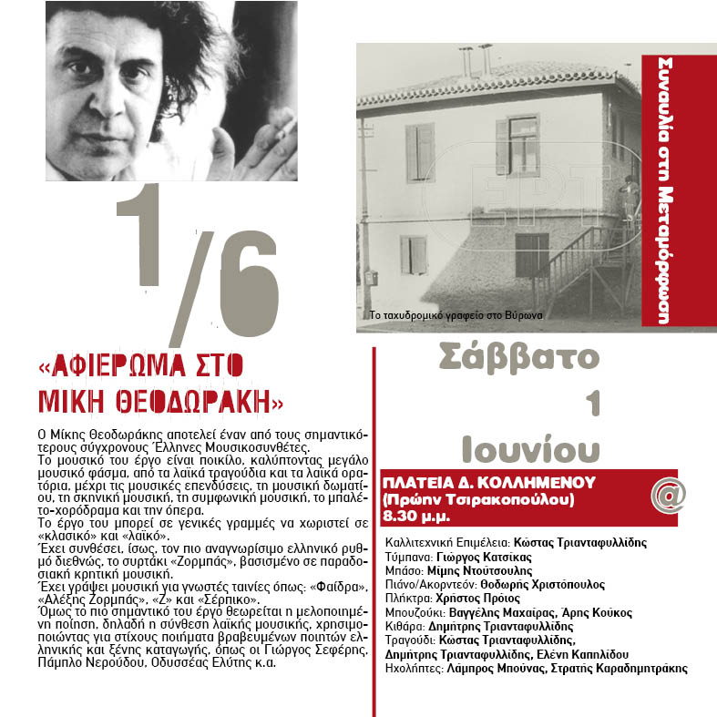 Γειτονιές Πολιτισμού 2013 Συναυλία: Αφιέρωμα στον Μίκη Θεοδωράκη - 20:30 - Πλατεία Δ. Κολλημένου (πρώην Τσιρακοπούλου)