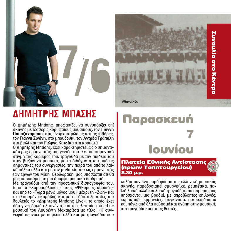 Γειτονιές Πολιτισμού 2013 Συναυλία: Δημήτρης Μπάσης - 20:30 - Πλατεία Εθνικής Αντίστασης (πρώην Ταπητουργείου)
