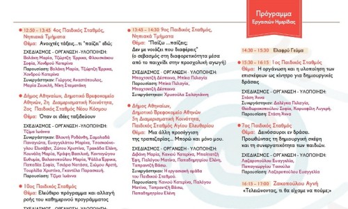 Στην ημερίδα θα παρουσιαστούν πρωτότυπες εργασίες που σχεδίασε, οργάνωσε και υλοποίησε το προσωπικό των βρεφικών και παιδικών σταθμών του δήμου μας, στα πλαίσια του επιμορφωτικού σεμιναρίου που πραγματοποιήθηκε, υπό την επιστημονική επίβλεψη της Αγνής Ζακοπούλου.