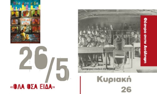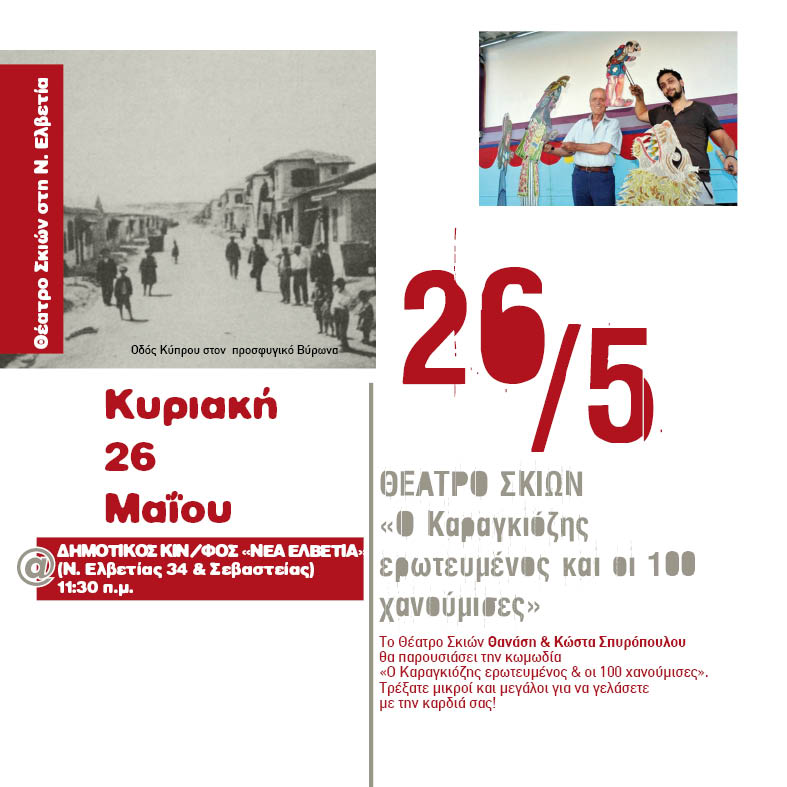 Την Κυριακή 26 Μαΐου, στις 11.30 π.μ. στο Δημοτικό Κινηματογράφο «Νέα Ελβετία», το Θέατρο Σκιών Θανάση και Κώστα Σπυρόπουλου παρουσιάζει την παράσταση «Ο Καραγκιόζης ερωτευμένος και οι 100 χανούμισσες». Τη σκυτάλη παίρνει στις 8.30 μ.μ. η παράσταση «Όλα όσα είδα» που παρουσιάζεται στην αυλή του 1ου Γυμνασίου και 1ου Λυκείου Βύρωνα (Γ. Γεννηματά 34). Πρόκειται για ένα έργο που φέρνει επί σκηνής τα προβλήματα της σημερινής Ελλάδας, της κρίσης, της ανεργίας, της φτώχιας, αλλά και της συγκίνησης, του χιούμορ και της επιβίωσης μέσα από το χαμόγελο.