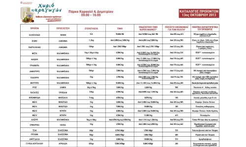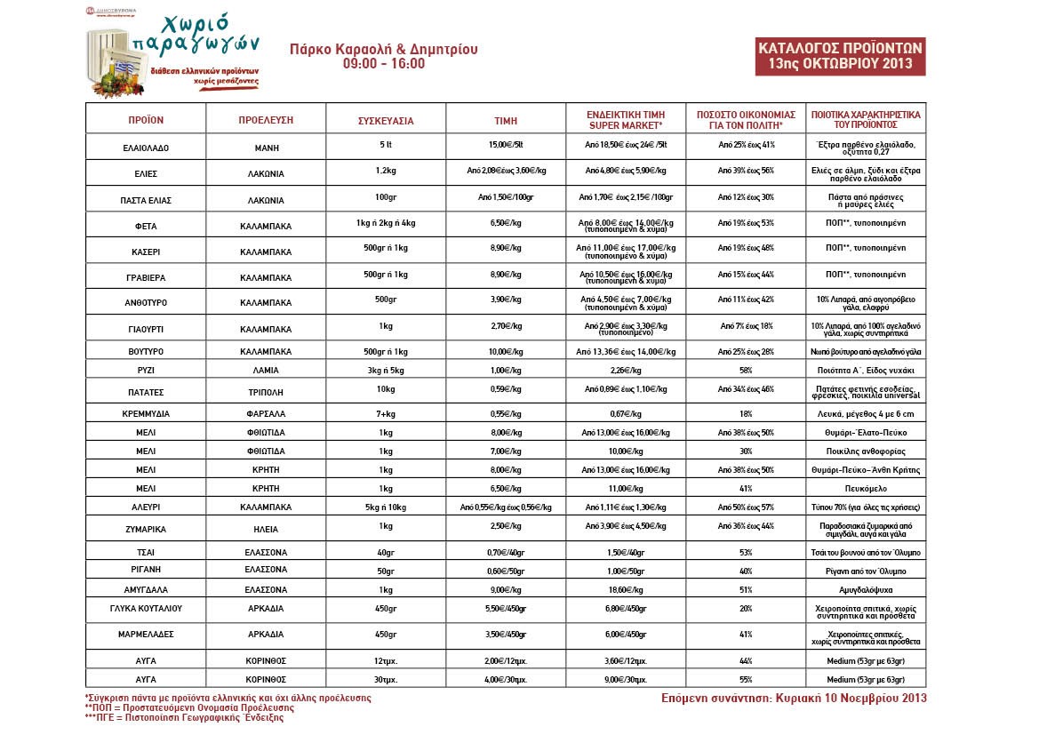 Στη συνάντηση της Κυριακής, οι καταναλωτές μπορούν να προμηθευτούν 170 ελληνικά προϊόντα, εγγυημένης ποιότητας και με πιστοποίηση ταυτότητας, σε ανταγωνιστικές τιμές, απευθείας από 25 παραγωγούς-συνεταιρισμούς από όλη τη χώρα, χωρίς μεσάζοντες. Ειδικότερα, στα προς διάθεση προϊόντα περιλαμβάνονται: ελαιόλαδο, ελιές, γαλακτοκομικά, ρύζι, πατάτες, κρεμμύδια, μέλι, αλεύρι, ζυμαρικά, τσάι, ρίγανη, αμύγδαλα, μαρμελάδες και γλυκά του κουταλιού, αυγά, φρούτα εποχής, λεμόνια, όσπρια, μανιτάρια, παξιμάδια, ρακόμελο, κρασί, σταφίδα, σάλτσα ντομάτας, κουλούρια, ξερά σύκα, λουκάνικα και παραδοσιακά προϊόντα από την Τήνο.