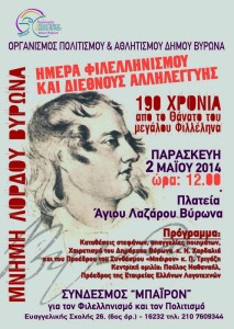 Την Ημέρα Φιλελληνισμού και Διεθνούς Αλληλεγγύης και τη μνήμη του μεγάλου ¶γγλου ποιητή και φιλέλληνα Λόρδου Βύρωνα, τιμά και φέτος η πόλη μας την Παρασκευή 2 Μαΐου, στις 12 το μεσημέρι, στην πλατεία Αγίου Λαζάρου.