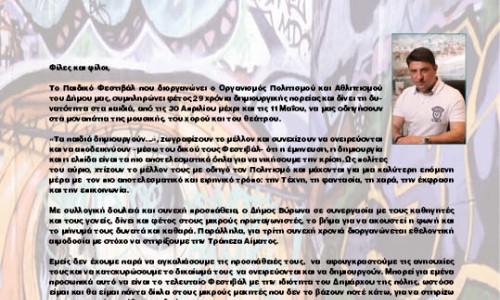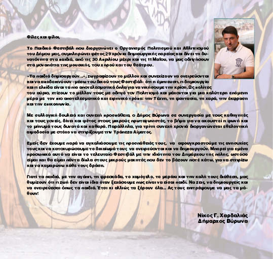 «Με συλλογική δουλειά και συνεχή προσπάθεια, ο Δήμος Βύρωνα σε συνεργασία με τους καθηγητές και τους γονείς, δίνει και φέτος στους μικρούς πρωταγωνιστές, το βήμα για να ακουστεί η φωνή και το μήνυμά τους δυνατά και καθαρά» επισημαίνει ο Δήμαρχος Βύρωνα Νίκος Χαρδαλιάς και προσθέτει: «Δεν έχουμε παρά να αγκαλιάσουμε τις προσπάθειές τους, να αφουγκραστούμε τις ανησυχίες τους και να κατοχυρώσουμε το δικαίωμά τους να ονειρεύονται και να δημιουργούν. Γιατί τα παιδιά, με την αγάπη, τη φρεσκάδα, το χαμόγελο, το μεράκι και την καλή τους διάθεση, μας θυμίζουν ότι η ζωή δεν είναι ίδια όταν ξεχάσουμε πως είναι να είσαι παιδί».