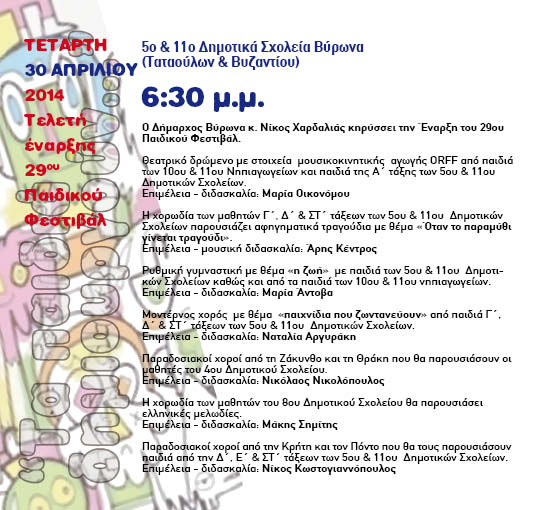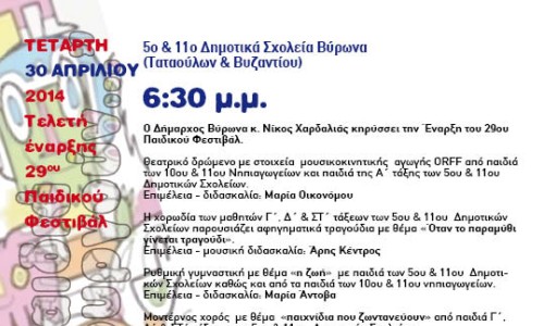 Η τελετή έναρξης του Φεστιβάλ, το οποίο διοργανώνει ο Οργανισμός Πολιτισμού και Αθλητισμού του Δήμου, είναι την Τετάρτη στις 6.30 το απόγευμα, στο 5ο & 11ο Δημοτικά Σχολεία Βύρωνα (Ταταούλων & Βυζαντίου). Στο πλαίσιο της εκδήλωσης έναρξης, μικροί και μεγάλοι μαθητές των σχολείων της πόλης μας, παρουσιάζουν ένα θεατρικό δρώμενο, αφηγηματικά τραγούδια, ρυθμική και μοντέρνο χορό αλλά και παραδοσιακούς χορούς από τη Ζάκυνθο, τη Θράκη, την Κρήτη και τον Πόντο.