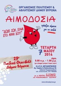 Εθελοντική αιμοδοσία για την ενίσχυση της Τράπεζας Αίματος για παιδιά, πραγματοποιείται την Τετάρτη 7 Μαΐου, 9π.μ.-1μ.μ., στο ΚΑΠΗ Μεταμόρφωσης (Καλλιπόλεως και Αγίας Σοφίας), στο πλαίσιο του 29ου Παιδικού Φεστιβάλ της πόλης μας.