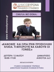 Οι κανόνες και τα όρια στην προσχολική ηλικία είναι το θέμα της ενημερωτικής ομιλίας που διοργανώνουν οι Δημοτικοί Παιδικοί Σταθμοί του Βύρωνα, την Δευτέρα 12 Μαΐου, στις 6 το απόγευμα στο Δημαρχείο της πόλης, στο πλαίσιο της ευαισθητοποίησης των γονέων για σημαντικά ζητήματα που σχετίζονται με τα παιδιά.