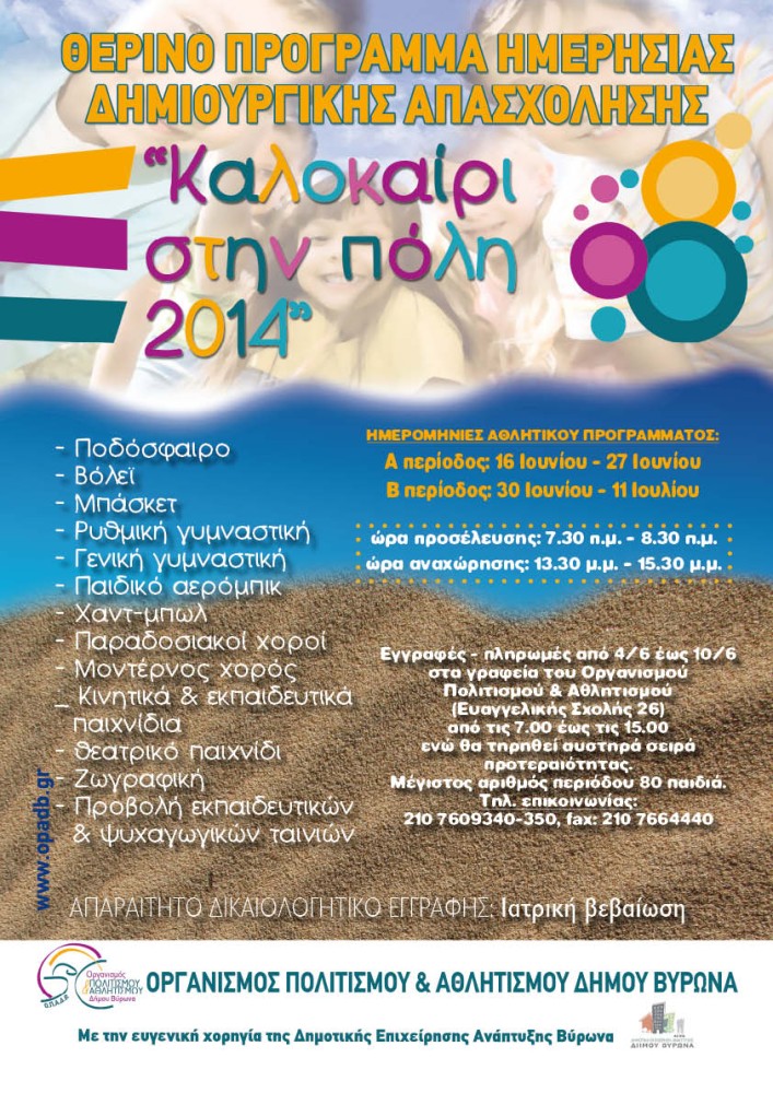 Την Τετάρτη 4 Ιουνίου ξεκινάνε οι εγγραφές για το θερινό πρόγραμμα ημερήσιας δημιουργικής απασχόλησης παιδιών «Καλοκαίρι στην πόλη 2014», που διοργανώνουν για πέμπτη χρονιά ο Δήμος Βύρωνα και ο Οργανισμός Πολιτισμού και Αθλητισμού, από τις 16 Ιουνίου έως τις 11 Ιουλίου.